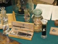 На зеленом сукне резного стола из красного дерева расставлены рабочие инструменты: старинный бронзовый микроскоп, лупа из того же металла, набор литер для печатания этикеток, препаровальные инструменты с ручками из черного дерева. Рядом склянки с препаратами экзотических морских животных. И, конечно, печатная машинка — редкая и дорогая вещь по тем временам.